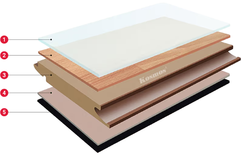 Kosmos sử dụng lớp xốp IXPE (lớp đế cao su IXPE), một loại vật liệu được làm từ nhựa polyethylene, giúp cách nhiệt tốt, chống ồn hiệu quả, chống thấm nước và ẩm mốc, độ bền cao. Ngoài ra, khi thi công không cần trải thêm lớp xốp.